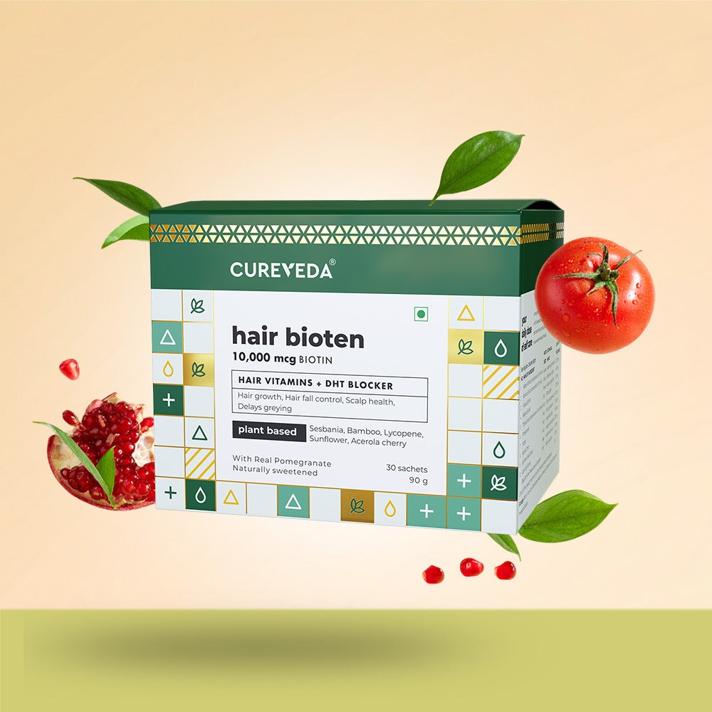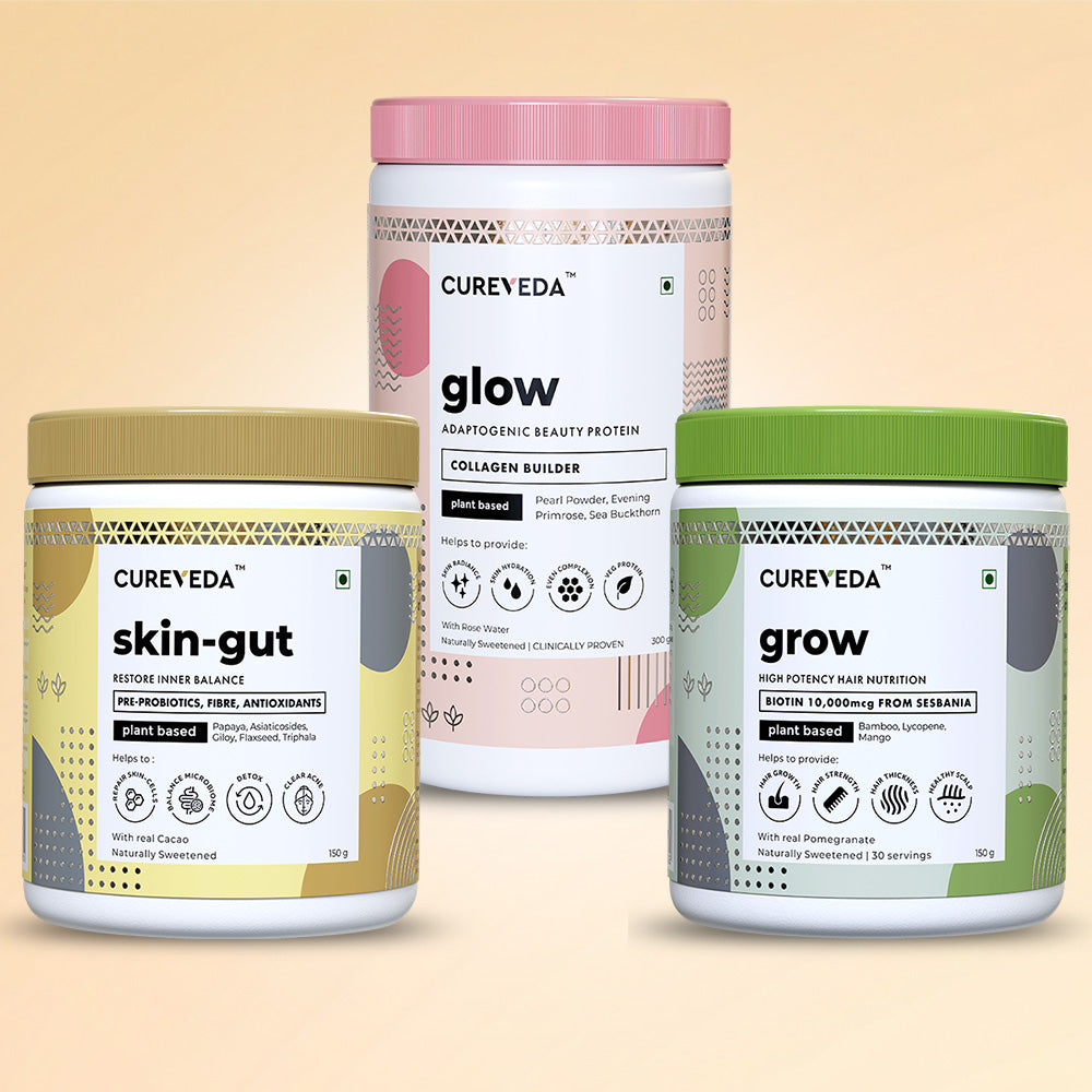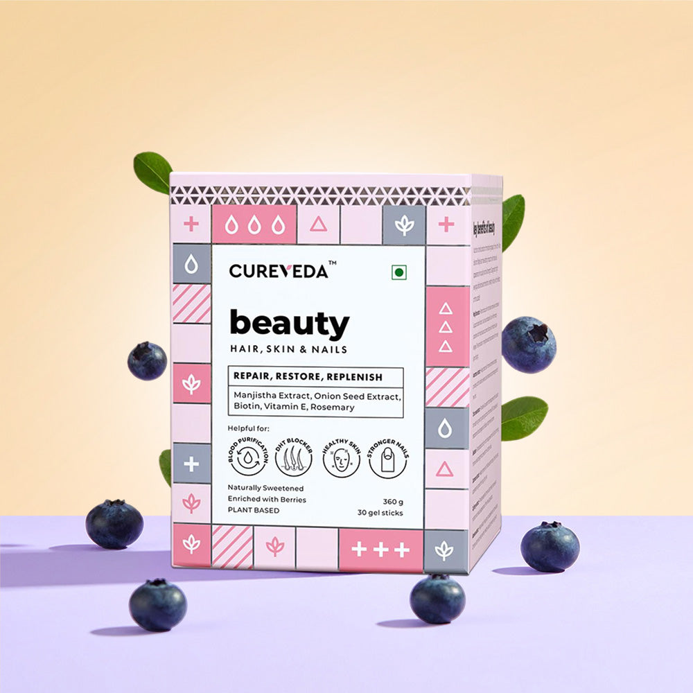 Cureveda Beauty contains ingredients like manjistha extract, jatamansi extract, Vit E, Biotin, onion seed extract etc. to provide natural glow to skin, improve hair thickness & prevent hair loss. It also helps to improve strength of nails.