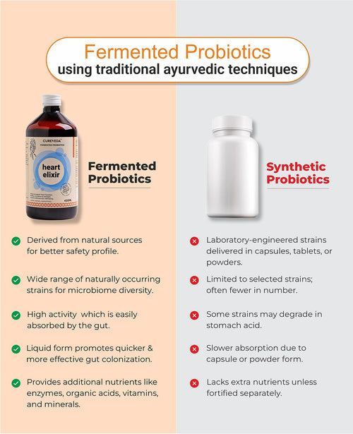 It includes fermented strains, acting as a probiotic supplement and improving gut-heart nutrient absorption.