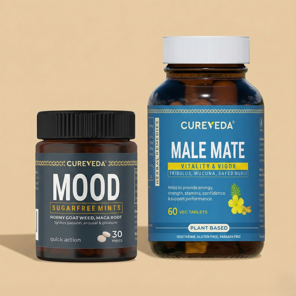 Cureveda Performance & Pleasure Combo pairs Male Mate for strength, stamina, and testosterone support with Mood Mints for fast-acting arousal and enhanced pleasure—designed to elevate performance and intimacy, together.